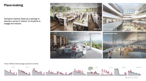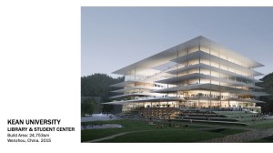 The new Wenzhou Kean University Student Center and Library will showcase the world-class education of the university with innovative design solution, brining in the latest trends and development of the contemporary library and student center. Following a strong axial master plan, the STUDENT CENTER and LIBRARY, at the heart of the campus, interface between academic and the living quarters. This will be the place for students to contemplate, to engage, and to explore. It is to become THE LOCUS OF STUDENT LIFE. The design emphasis on transparency, which is the physical manifesto of openness – the very essence of contemporary American college life. The floor-plates extend to become horizontal slices, which give presence of the prominent building at the terminus of campus axis, as well as framing views to the surrounding when viewing from the inside. Through re-thinking about conventional library and student center programs, the programming concept is to discover overlapping functions and reprogram into new functions that suits the new generation of student life. This becomes the PUBLIC COMMON program – the place where students will have their most memorable moment in their college life. Taking the grand steps as the prototype and develop into a series of stairs typology, a variety of spaces that allows student activities to happen freely. The experience extend to the outdoor and become landscape feature.