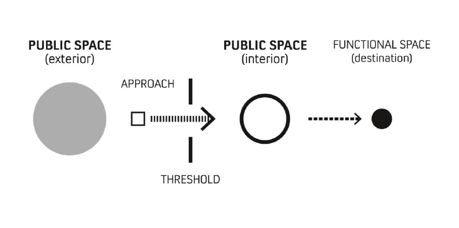 The spaces at a cultural building can be categorised into three types: exterior public space, interior public space, and functional space. The exterior and interior public space are spaces associated with the cultural institution but free for the general public to use, while the functional spaces are specific destinations such as galleries, the concert hall or auditorium, accessible only to ticket-holders. The flow between various type of spaces and the movement across threshold demonstrate spatial permeability, while the figure-ground diagram with functional (destination) in porche can reveal accessibility and connectivity of public spaces.