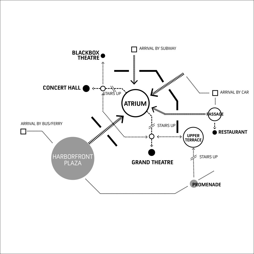 The spatial structure diagram denotes a tree-structure organization with the atrium as the centre. This space is accessible from multiple directions, where different approaches gather at the atrium space that act as a distribution point to various functional spaces of theatre and concert hall. Besides the ground level public space, the original design included an upper level foyer connecting to the terrace walkway, which turns it into a ring-structure that allows multiple routing option. However, the upper level is now accessible only to ticket-holders to performances, such operational control has reduced the more liberal ring-structure into the hierarchical tree-structure.