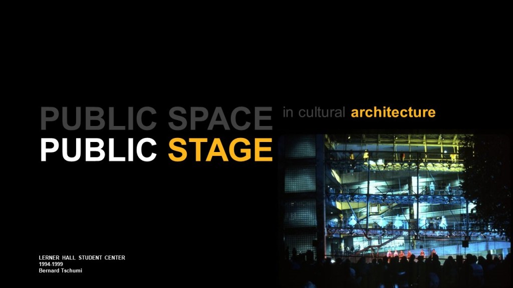 Bernard Tschumi sees the essence of architecture as the action (or performance) that happens in space, and since his early career he explore how action inform space through documentations (Manhattan Transcript), landscape planning (Parc de la Vilette) and built space (Lerner Hall). There is the famous “manifesto” by Tschumi that say “To really appreciate architecture, you may even need to commit a murder” – what he means is of course not that you should kill for architecture, but how events is what makes architectural space come alive.
