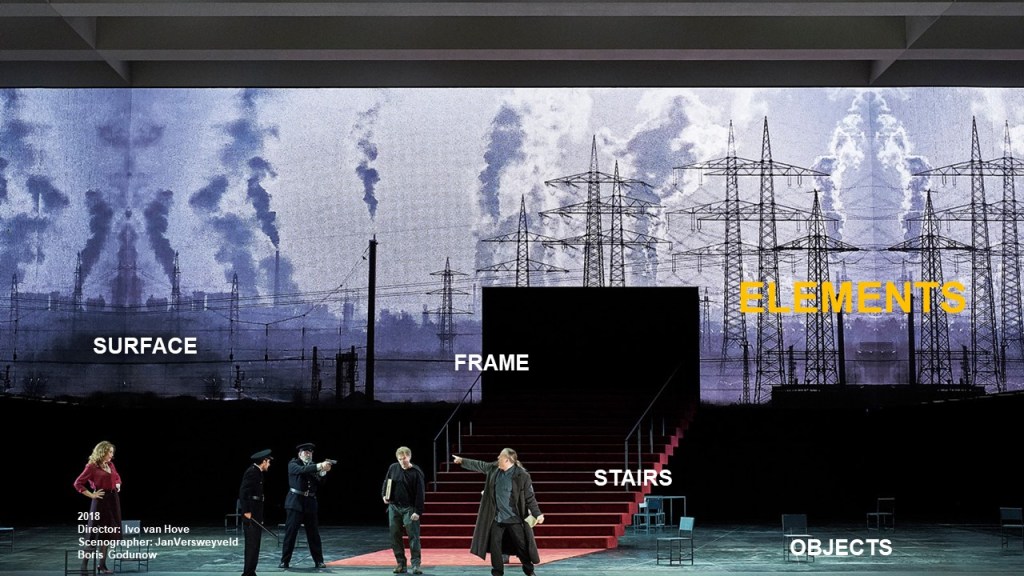 In this other production Boris Godounov, a classic opera about Russian monarchy, there is no golden fixtures or the grandiose staircase of a palace – these intention and drama is represented by the simple spatial elements. Nowadays with advance in stage technology, the “backdrop” of traditional theatre become the digital screen, which has opens up another whole new dimension of the depth of space. The surface also allows for an opening, to create a threshold condition that is important in theatre to portrait entry/exit of the character. The stairs as a structure works to allow actions such as ascension or descension, or the position above or below to represent power relations in a monarchy story. A collection of repetitive objects are used to loosely define space and relation, also flexible items that can work with the actor’s motion. These elements speaks to the essence of movement and positions, without the need of any decorative details.