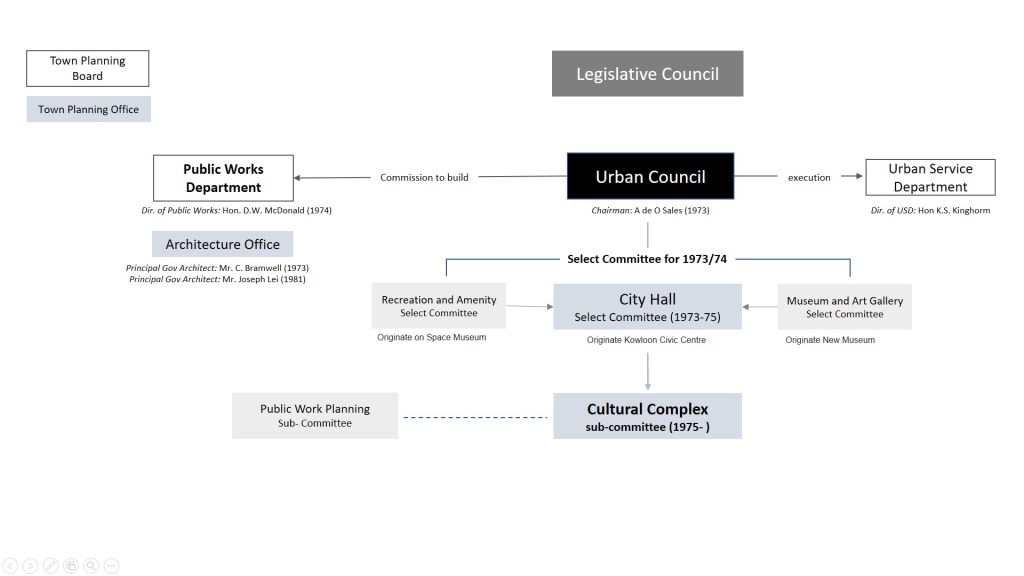 The Urban Council in the 1970s saw the necessity in building physical facilities to provide civil services, which has a “direct bearing on the quality of life of a community…” (Annual Report 1974/75), and became the largest developer/landlord of cultural facilities across the territory. The Cultural Complex in Tsim Sha Tsui was its keystone project in the 1970s, with capital cost funded by the Government while the Urban Council responsible for future operation cost. Within this organisational and funding structure, the UrbCo presumed a role as the “client” and the PWD as the “consultant” architect. The chairman of the Urban Council, Mr. A. de O. Sales, was an ambitious man and made major decisions during the development process, which his authoritative execution has earned him the nickname “the Tsar” (沙皇), taken from the first word in his Cantonese name combined with “king”.