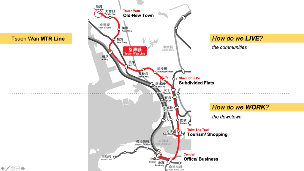 The MTR Tsuen Wan Line (red line) is one of the three original metro lines in HK opened in the 1980s, connecting the business center Central with commercial district Tsim Sha Tsui, and through different communities in Kowloon and terminates at the Tsuen Wan new town. The studio project takes the red line as a framework of investigation to offer a broad view of diverse urban conditions in Hong Kong, from the Commerce & Business to Culture & Tourism, and from grass root neighborhood to first generation new town. Students will examine urban issues and conduct comparative study of the distinct urban districts. Both the metro line and the area along it has been through many changes since it’s development three decades ago. As the city is expanding with new metro lines and new new-towns, it would be a timely opportunity to review the core urban area and its transformation and implication.