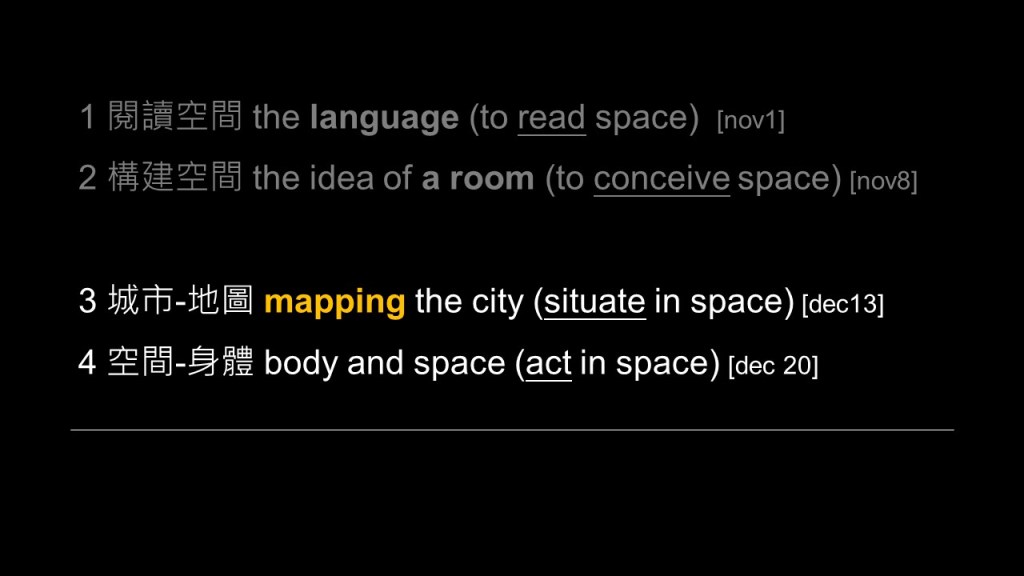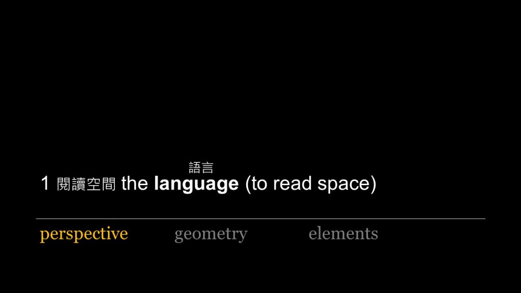 If we understand scenography as “the writing of the scenic” (Kjellmer & Rosen, 2020), this notion gives us further imagination of space, as the writing relates to how we read/perceive space in order to create, and the scenic emphasis on the experience as one situates in space. Both the reading and the experience of space are equally applicable in the practice of architecture, which the following sessions will look at it in four parts: to read space (the language), to conceive space (the room), to situate in space (the mapping), to act in space (the body).