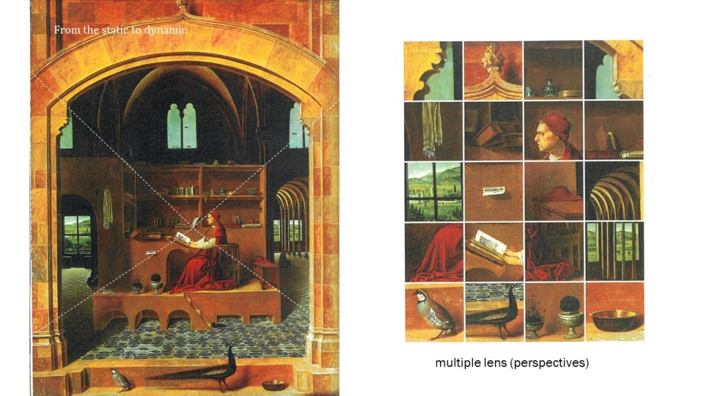 The proscenium is the common setup in classical theatre to create an illusion of a deep space extended behind the frontal plane. This sense of space is constructed by the drawing skill of perspective developed during the Renaissance, which is also a common method in architecture to design and represent architecture and space constructed through a set of project lines from a single origin. The purpose at that time, before the invention of the camera, was to create an almost realistic image of what one might see created, also suggesting the extended space out beyond the frontal plane to build up the “context” or the “scene”.