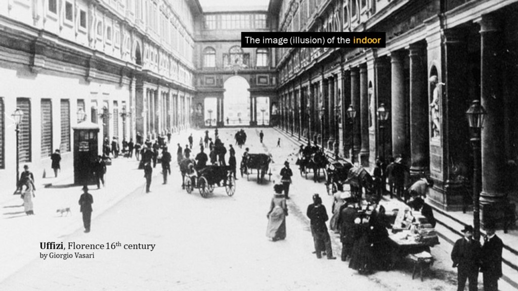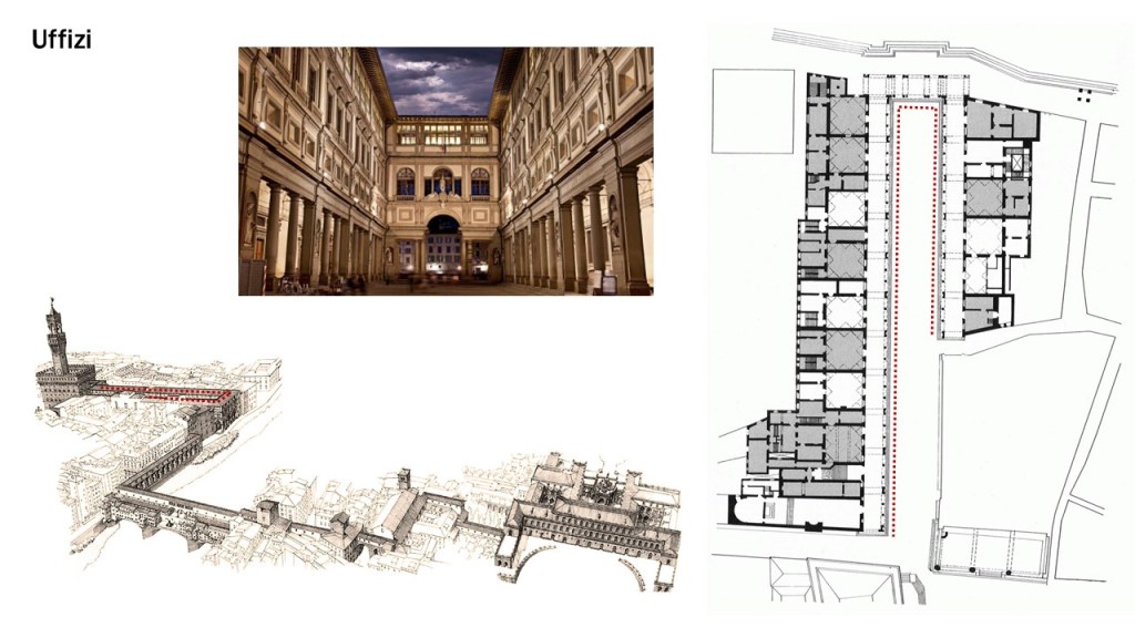 This idea of the “urban living room” was nothing new; it is the plaza that defines open space and gives the impression of interiority, where activities can be contained, and people socialize. Taking the example of the Uffizi in Florence, it embodies an urban living room. This idea of the room can be elaborated into an experience that extends from one building to another and forms a journey. The uniform colonnade is not a solid façade but a permeable “screen” that further defines the path of semi-covered space. That is how it makes the journey or a guided path (the cloister).