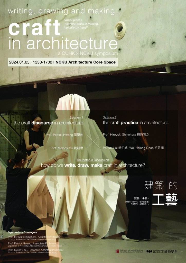 From traditional guilds of craftsmen to contemporary digital fabrication and construction, the practice of architecture is always associated with crafts and craftsmanship. Beyond the tactile quality of the case of built objects, the craft quality is manifested in the architectural process, inseparable from the acts of drawing and making. This symposium gathers architects, designers, and scholars to discuss their research and design projects on craft in architecture and its challenges and potential in contemporary architectural practice.