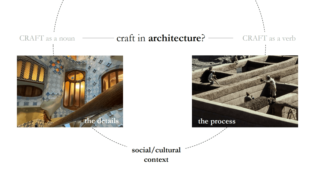 Craft is usually discussed as an object or an artefact, for “craft” is defined as “the work of making by hand”. Putting it into the context of architecture, what does “architectural craft” mean then?