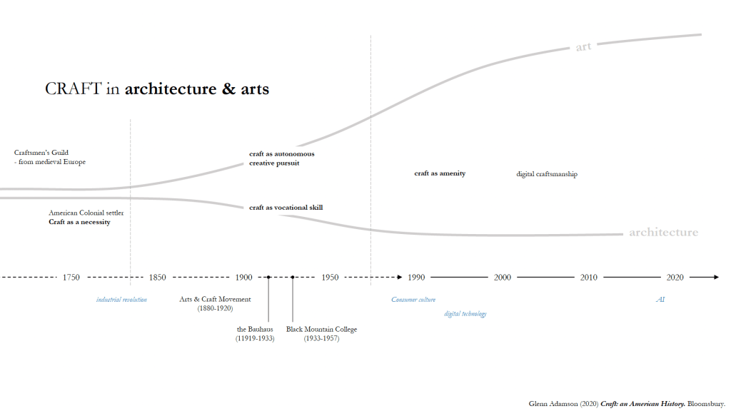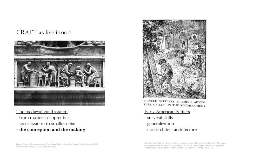 Before the Industrial Revolution, the craft was an inseparable part of architectural production. The medieval craftsmen are makers of everything essential in life, from pottery to metalwork. The guild formalises its organisation through apprenticeship, where the skill of a particular craft is learnt through repetition over years of practice – as “crafting”. In the early 18th century American settlers, craft is not only a trade but an essential or survival skill. With few resources, the making process became more generalised, where every man built their own home with their hands. These were the pre-industrialisation ideas of craft.