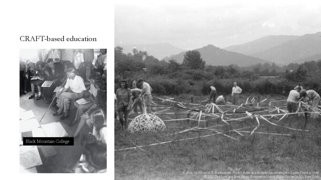 With the disruption of WWII and the Nazi invasion, craft-based education was brought from Bauhaus to the US, and a couple of former teachers in foundation studio and textile, Josef and Annis Albers, landed in North Carolina – the Black Mountain College. What the Albers did in BMC was to push further the idea of craft in Bauhaus, from acquiring the skills to perfect a craft object to the emphasis on making and internalising the craft-based skill to think and design. There is a transition from focusing on craft as the end to the means, from pursuing the perfectly crafted object to emphasising the process of “crafting”.