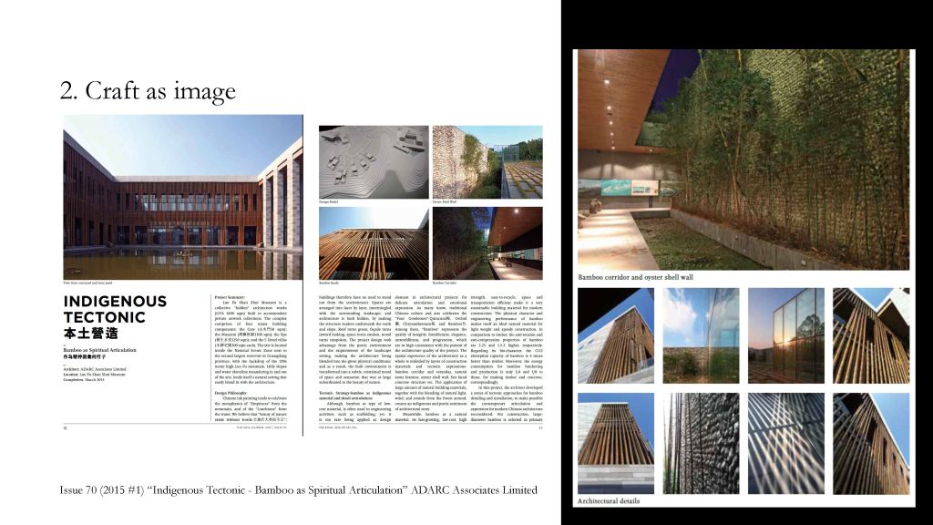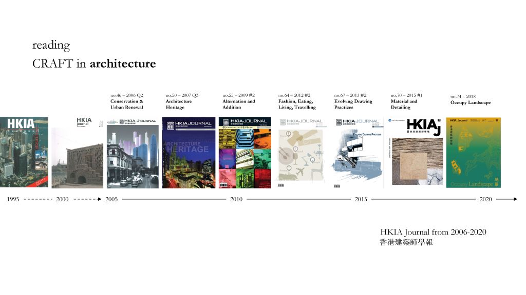 To trace the positioning of craft in architecture in Hong Kong, we read through the HKIAJ from 2006-2021 to see how craft is perceived (and represented). It is a trade-based rather than a research-based journal, which started in 1995 as an internal circular for its members. Therefore, its content mainly focuses on showcasing projects with descriptive design statements.