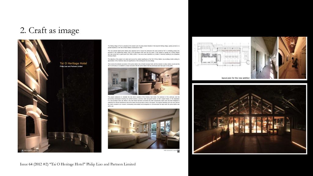 However, reading its editorial theme and projects introduced can reveal a disciplinary discourse in HK in the past 20 years. Through different generations of editorial members, it has slowly transitioned from a functional typology theme to a more topic-based exploration of the industry’s current landscape. While several issues look into heritage conservation (issue 50, 2007) and one (issue 70, 2015) on material and detail, there is yet to be a dedicated issue that focuses on craft application in architecture. A reason could be that the craft discussion is usually about small-scale artefacts, which constitute a minor part of the comprehensive building or masterplan project. While architects tend to discuss their projects in larger concepts and spatial organisation, the spirit of craft and craftsmanship is embedded into the construction and details – especially in conservation projects.