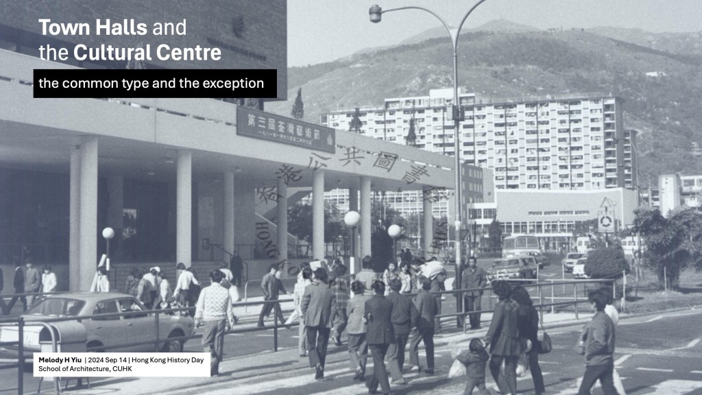 Built to achieve a “balanced lifestyle” for living and working, as well as leisure, the new towns are planned with amenities such as parks, sports grounds, and cultural facilities — the town halls. My sharing today will be about the cultural buildings of the 1980s, known by different names: the Town Hall / Civic Centre / or Cultural Centre. In essence, they are collectively a common type — which has greater significance as a concept that can propagate rather than individual architectural objects. Furthermore, instead of being an exclusive palace of arts, the cultural centre as a typology has an inherited social purpose — as a community place that brings “culture” to the public, referring to the paradigm of democratisation of culture in welfare state cultural policy.