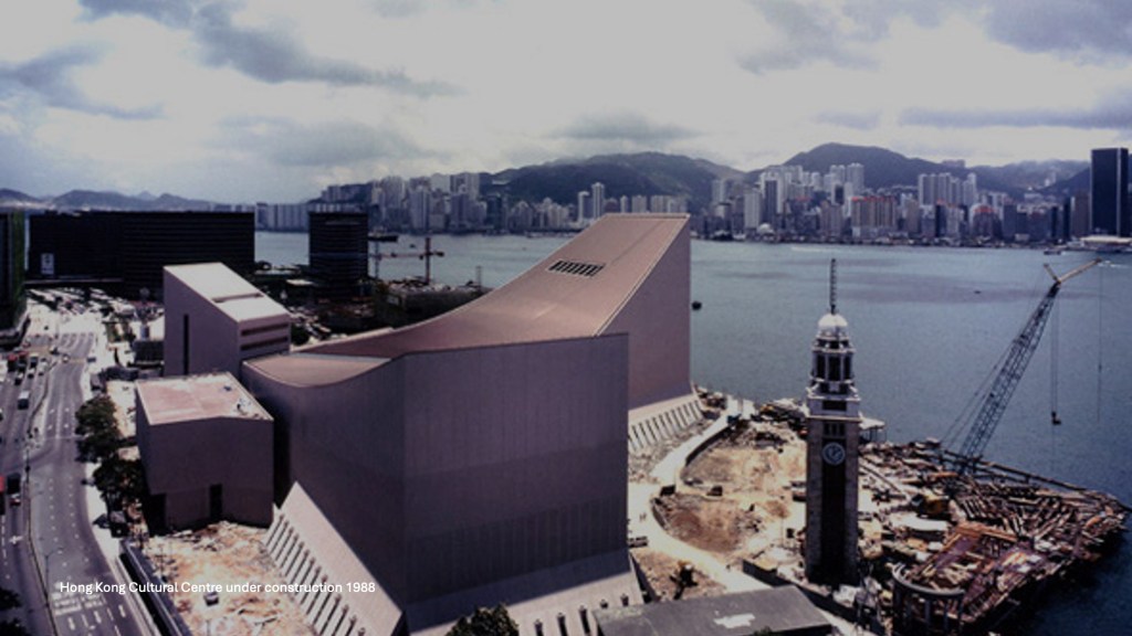 Unlike the “factory production” of nominal public buildings designed by the PWD AO, the Hong Kong Cultural Centre (HKCC) design was given special attention. It was designed by the then-senior government architect Jose Lei, who later became Director of the Architectural Service Department (ArchSD). In an interview at the time of the HKCC opening, Lei recalled it as the “commission of the lifetime” for him. Although the brief given was just a standard program for a generic cultural centre, through his acquaintance with Urban Council chairman Sales, he recognised the significance of this project, which would require a “memorable form and image.” It carries an ambition as the landmark of the aspiring global city, benchmarked to the well-publicised waterfront Sydney Opera House opened around the time of the HKCC’s conception. It was an invested endeavour of almost $500 million, with the engagement of expert consultants, from structural engineers to theatre and acoustic specialists. Lei selected a team of young local architects dedicated to overseeing the lengthy process of its design development and construction.