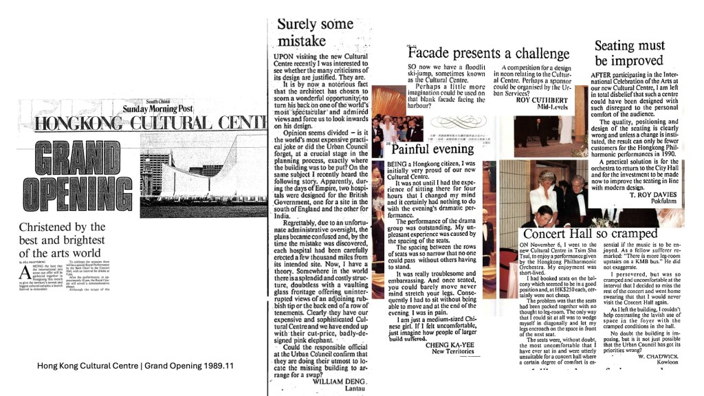 The opening in Nov 1989 was a spectacular event that suited the positioning of the cultural landmark. It was opened by then-Prince Charles and Princess Diana, with a month-long inauguration arts festival by renowned artists from around the world. It was well covered in both English and Chinese press: the SCMP produced a 10-page special supplement to celebrate the occasion, and even the New York Times had a half-page report in December 1989, marking it as the most important event in urban and cultural development in late colonial Hong Kong. It was dubbed “the last gift from the colonial government to the territory.” However, it has also received many complaints and critique. Many questioned that its concert halls were uncomfortable despite of the high construction cost. And its windowless form and the “bathroom tiles” on the façade are criticism that we would still hear nowadays.