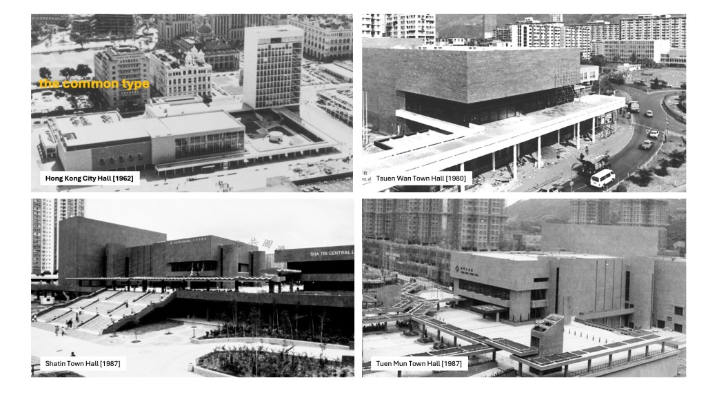 The City Hall, opened in 1962, was the first modern public cultural facility in Hong Kong, which has become the archetype (a standard) for many other public cultural buildings. At that time, the PWD AO was swamped with the high demand for public construction. With a problem-solving spirit known among the HK civil servants, the City Hall architectural plan was directly adopted in the early town halls to save time in designing and preparing construction documents. Therefore, the architectural production of the common type was a pragmatic operation instead of a creative invention, with minimal iterations to accommodate site conditions or minor improvements.
