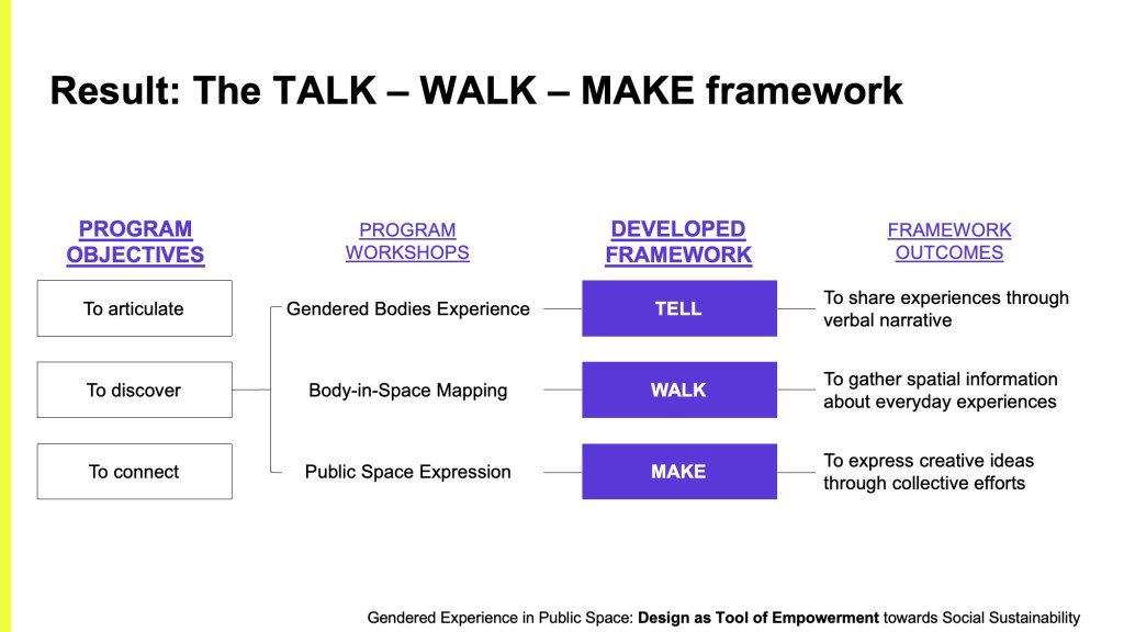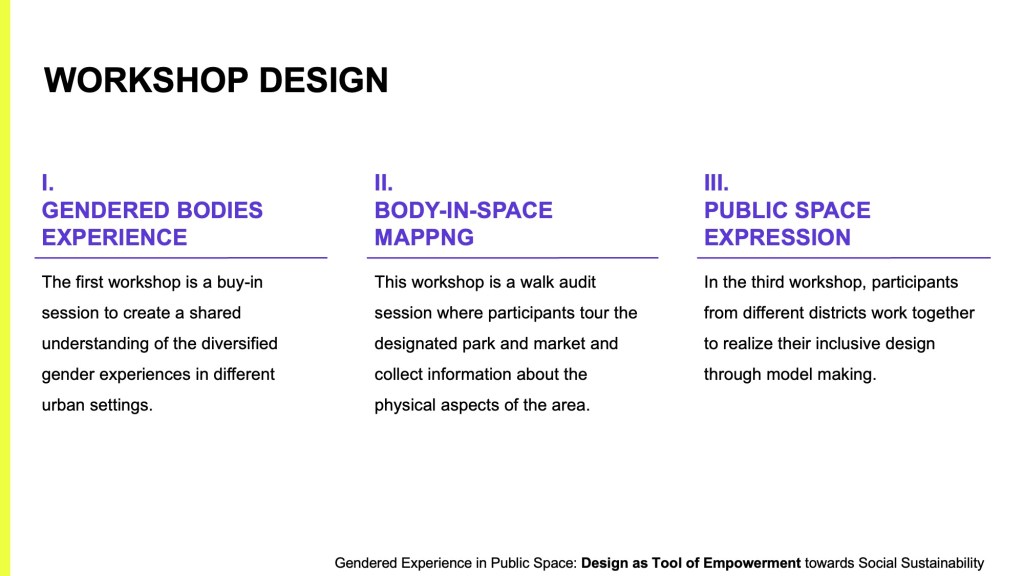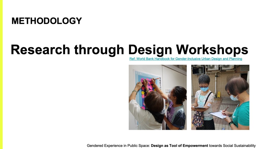 Although gender-inclusive design has received increasing awareness in recent years, the nominal consultation process tends to lack an in-depth understanding of female users’ genuine needs and experiences. A reason could be that women in Asian culture, especially those in domestic roles, are neither used to nor equipped to express themselves, therefore limiting their feedback to pre-established options. This paper investigates the gendered spatial experience and addresses the need for effective communication and creative expression by the undermined female voices. Current literature recognises the capacity of arts and cultural practice to engage and empower people, and this paper will demonstrate how the creative design process can be a form of gender empowerment through the case study of a public space design workshop in Hong Kong. While the immediate workshop findings describe the specific needs of female users in public spaces, this paper further reflects upon the programme design and process, with the results of establishing a framework to facilitate the expression and articulation of embodied gender experience. The paper concludes by highlighting domesticity in public space and how bodily engagement is essential in an experiential investigation to inform design. In response to growing literature and advocacy to foreground culture’s significance in social sustainability and gender issues, the research contributes to the discourse of gender empowerment through creative means and its position within the SDG framework.